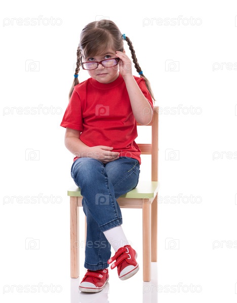 Девочка в красной футболке и очках позирует на стуле