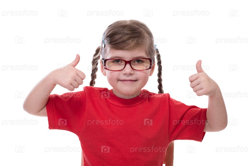 Девочка в красной футболке и очках показывает большие пальцы