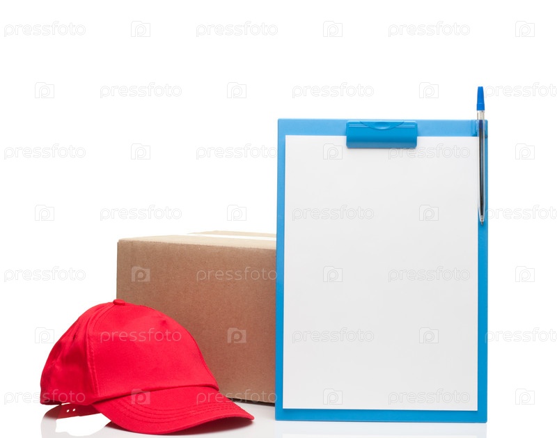 Композиция с планшетом, красной кепкой и картонной коробкой