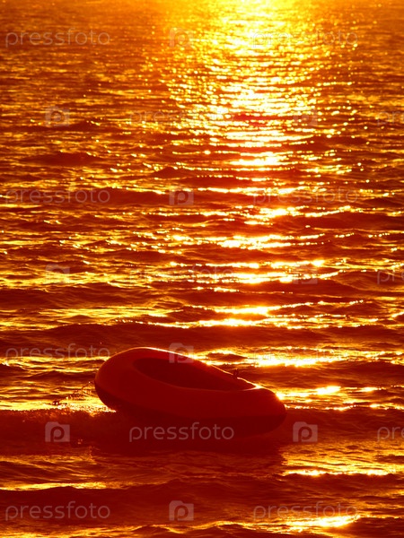 Резиновая лодка на поверхности воды в море в лучах заходящего солнца