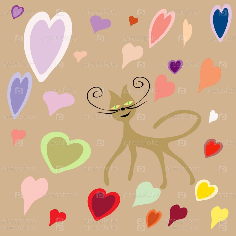 Кот на бежевом фоне с сердцами