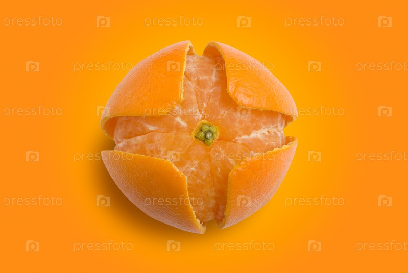 Очищенный мандарин в собственной кожуре на оранжевом фоне