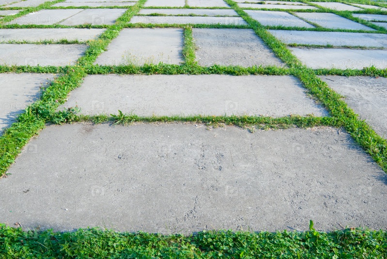 Зеленая трава растущая между стыками плит тротуара