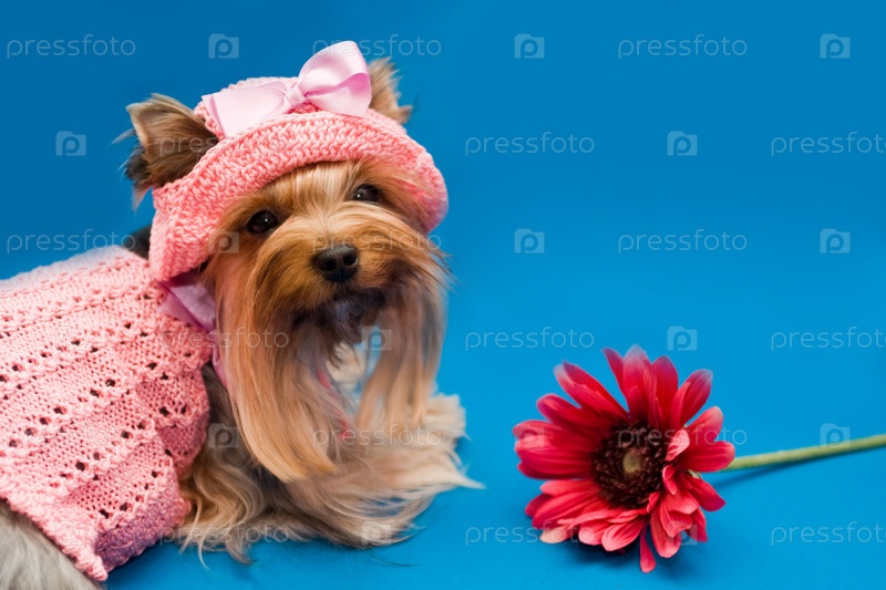 Портрет йоркширского терьера в розовом платье и шляпке с бантиком