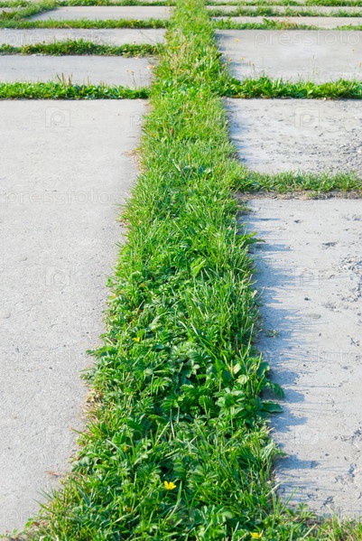 Зеленая трава растет между тротуарными плитами