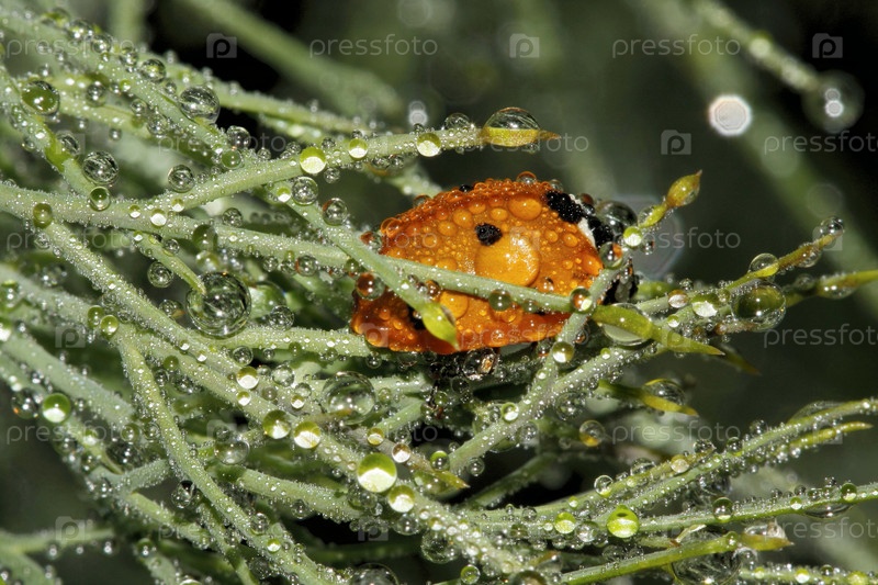 Божья коровка, сидящая на покрытых капельками росы стеблях травы
