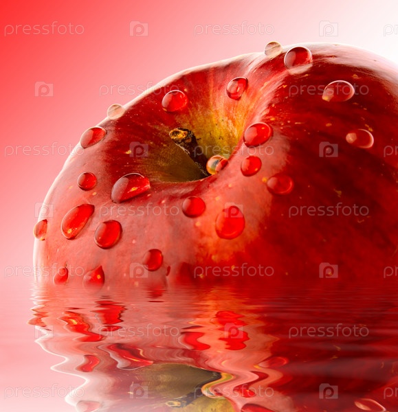 Сочное яблоко изолировано на красном фоне в росовой капле