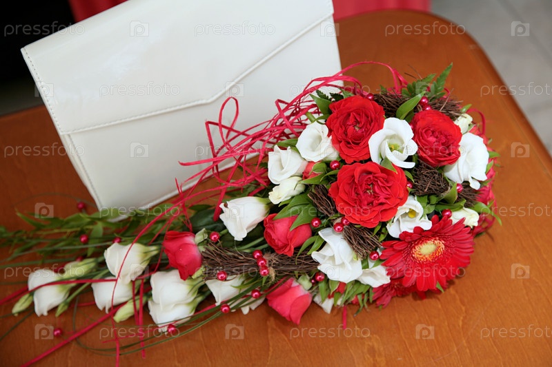 Свадебный букет и сумочка лежат на столе