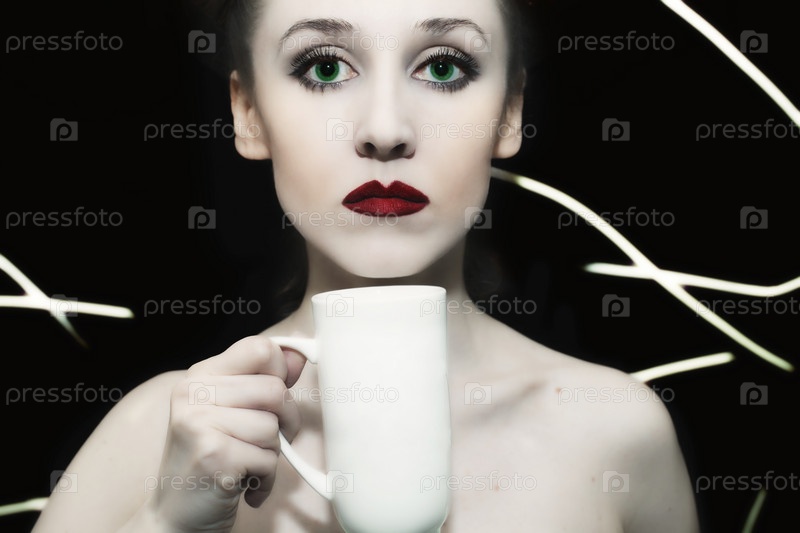 Девушка с зелеными глазами и красными губами держит в руке белую чашку на черном фоне
