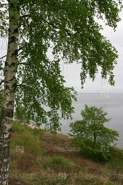Береза на туманном холме на фоне моря
