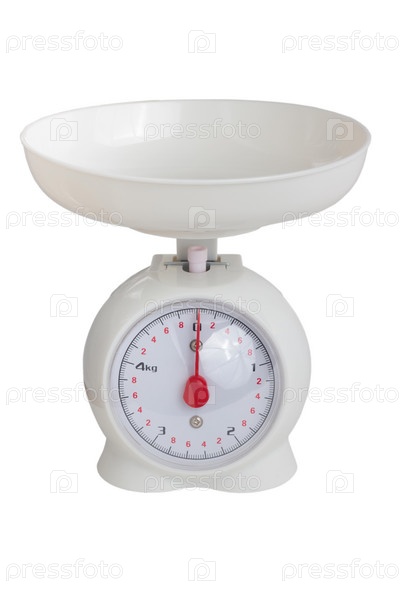 Белые кухонные весы, изолированные на белом фоне, обтравочный контур