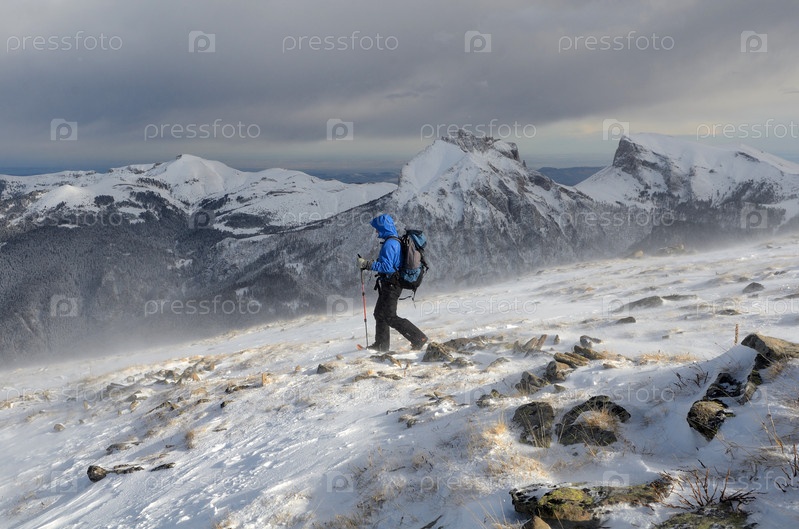 Турист в горах Адыгеи зимой (Западный Кавказ)