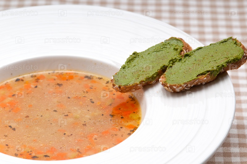 Итальянское блюдо Минестроне с песто кростини