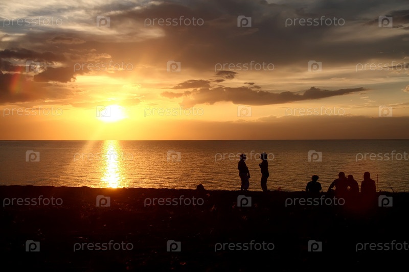 Силуэты людей на берегу на фоне заката