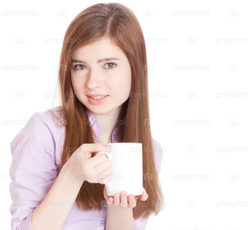 Молодая девушка с кружкой кофе, изолированная на белом фоне