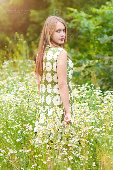 Красивая молодая девушка в поле среди ромашек