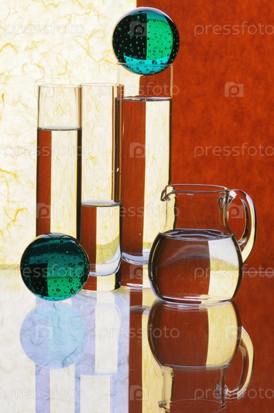 Кувшин и узкие вазы с водой и зелеными шарами