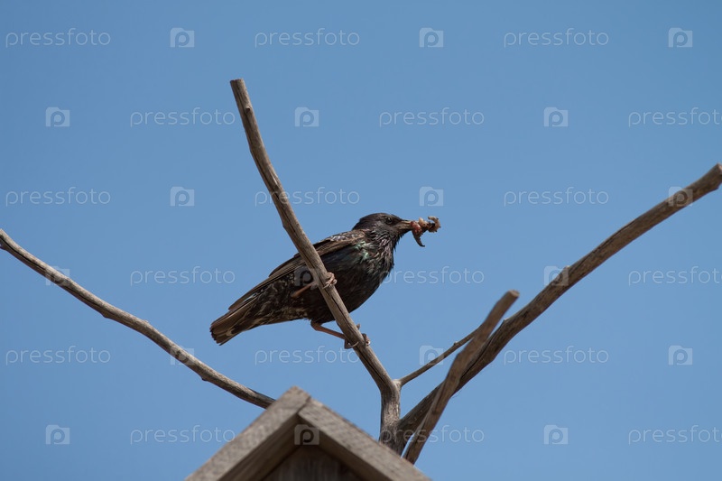 Птица с червяком в клюве сидит над скворечником