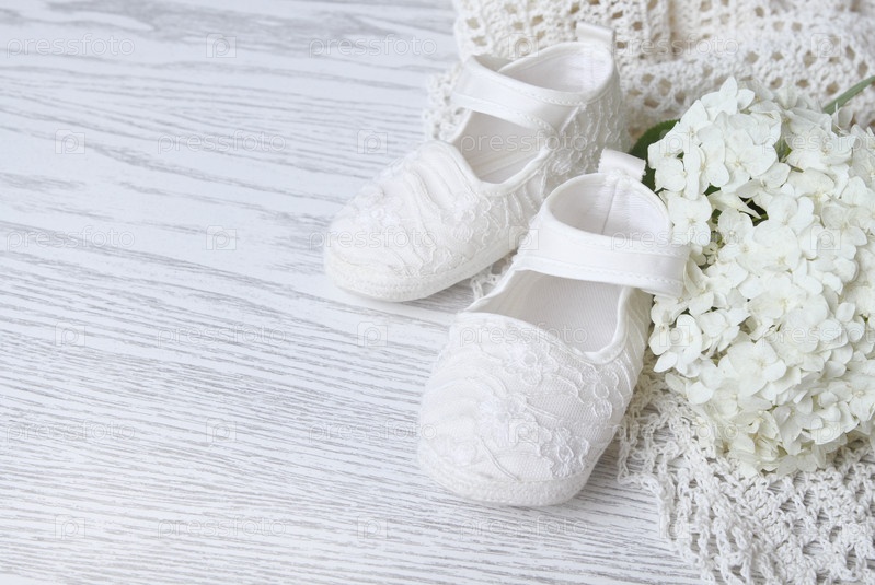 Белые детские башмачки и гортензия