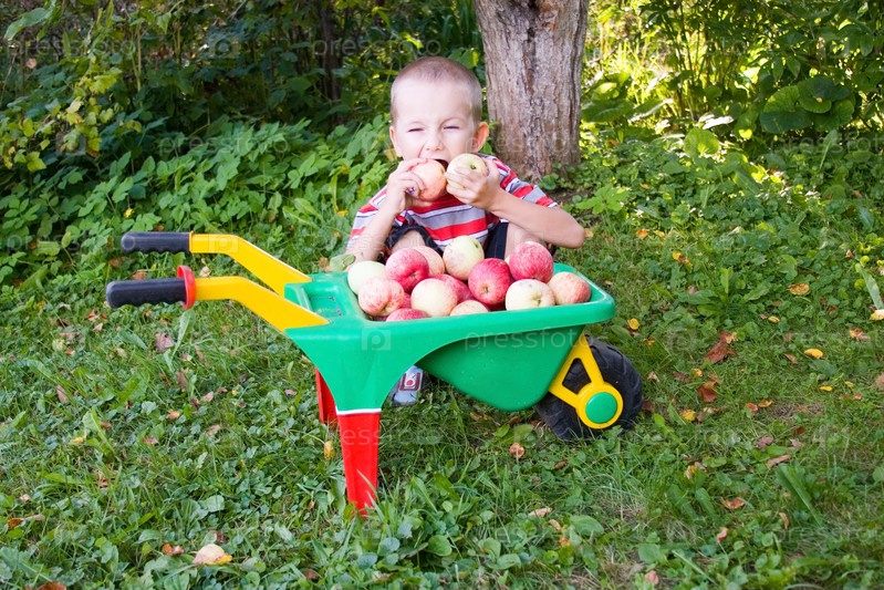 Мальчик с тележкой, полной яблок