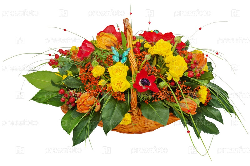 Цветочный букет в плетеной корзине, изолированный на белом фоне