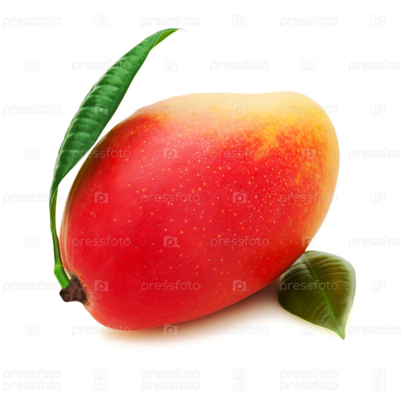 Свежий манго и зеленые листья, изолированные на белом фоне