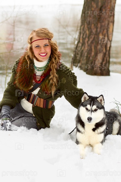 Счастливая молодая женщина с собакой породы сибирский хаски