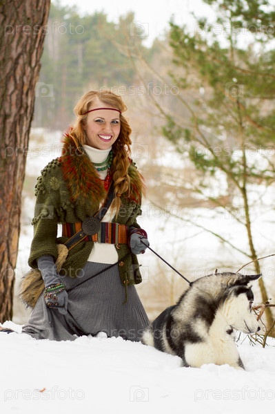 Счастливая молодая женщина с собакой породы сибирский хаски