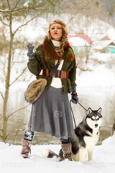 Счастливая молодая женщина с собакой породы сибирский хаски