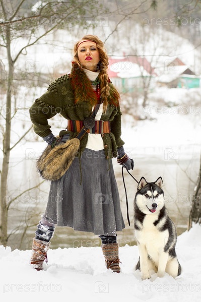 Счастливая молодая женщина с собакой породы сибирский хаски