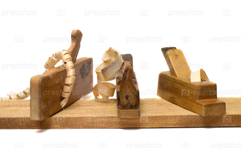 Три старых рубанка на доске, изолировано на белом фоне
