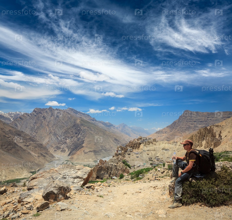 Турист отдыхает и пьет воду в Гималаях Долина Спити. Вблизи Данкар гомпа, Химачал-Прадеш, Индия