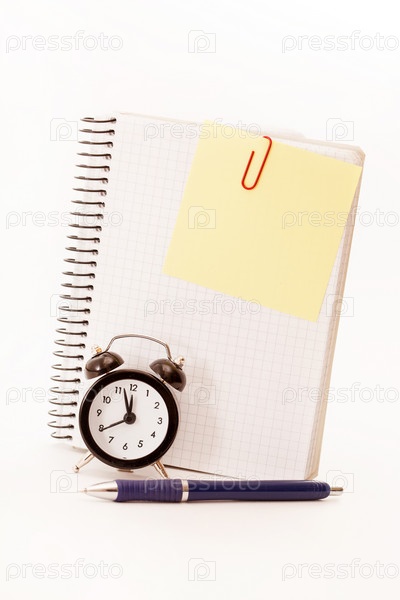 Будильник, чистый лист блокнота на белом фоне