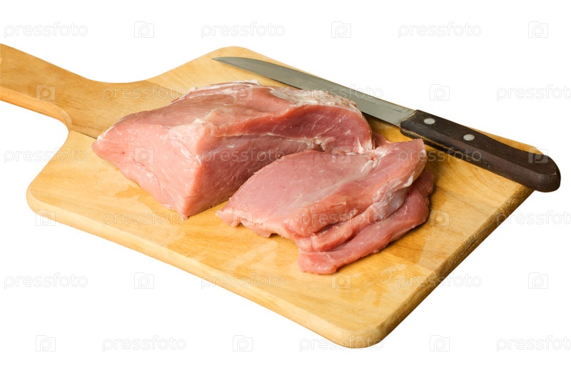 Кусок мяса свинины с нарезанными кусками на разделочной доске с кухонным ножом