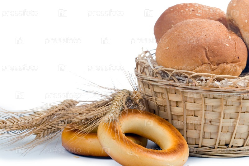 Корзинка со свежим хлебом, бублики и колосья пшеницы