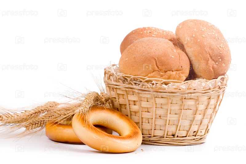Свежий хлеб в корзине, бублики и колосья пшеницы