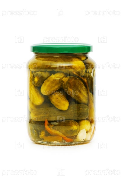 Консервы из огурцов, выделенных на белом