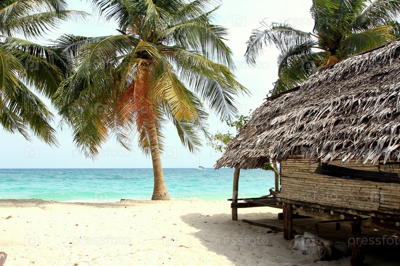 Пальма и бунгало на берегу Андаманского моря. Остров Бамбу-Ко Май Пай, Провинция Краби, Таиланд