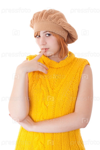 Молодая симпатичная девушка в желтом платье на белом фоне