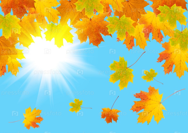 Множество желтых кленовых листьев на фоне ясного неба