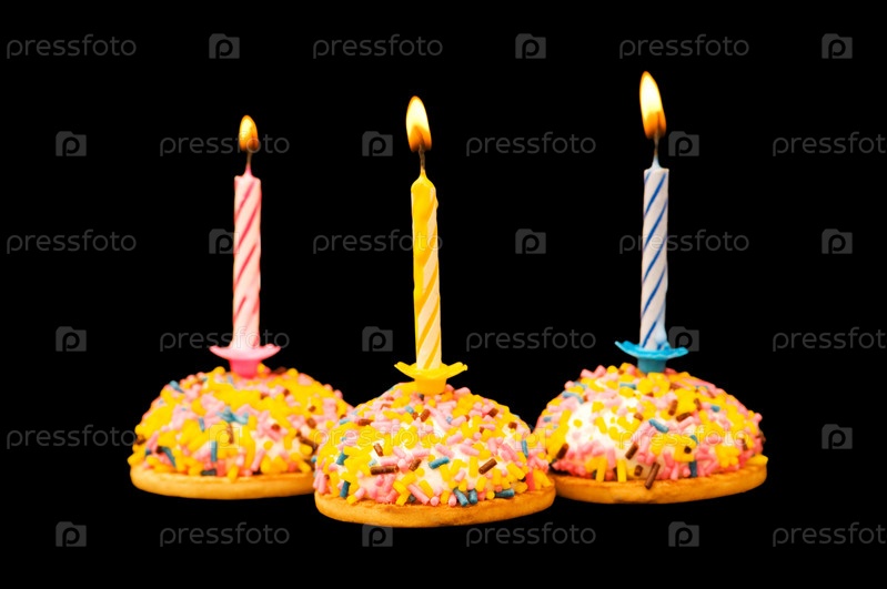 Пирожные с горящими свечами на черном фоне