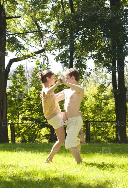 Парень с девушкой, танцующие на поляне