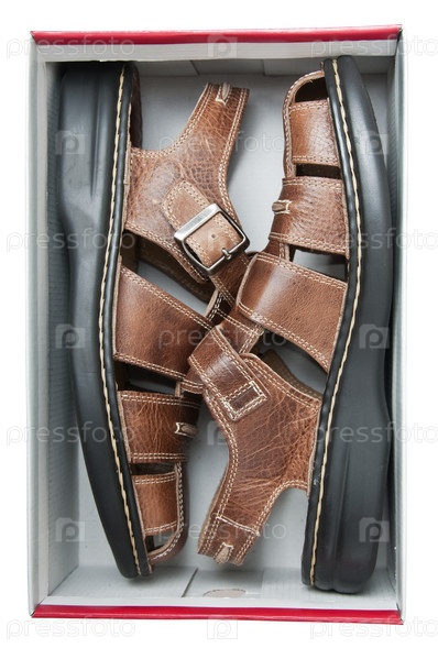 Новые мужские сандалии в коробке на белом фоне