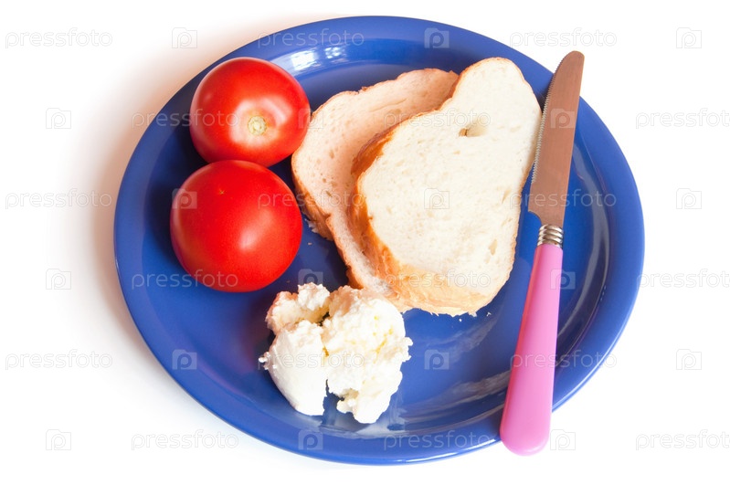 Кусочки батона, творог и помидоры на синей тарелке