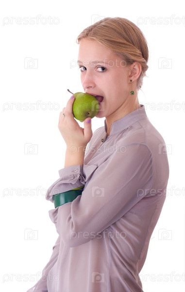 Молодая красивая женщина ест зеленую грушу