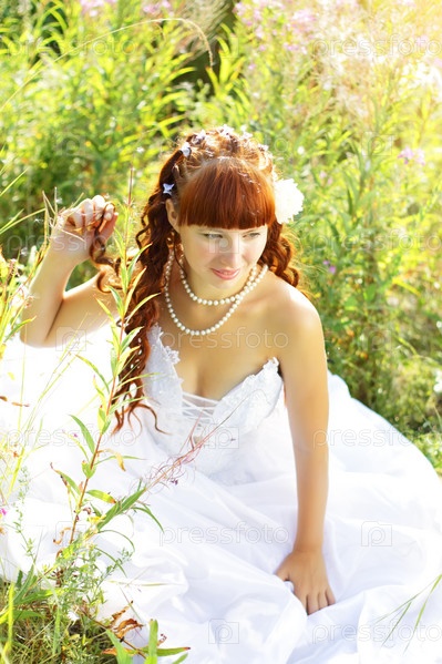 Красивая девушка в подвенечном платье на природе