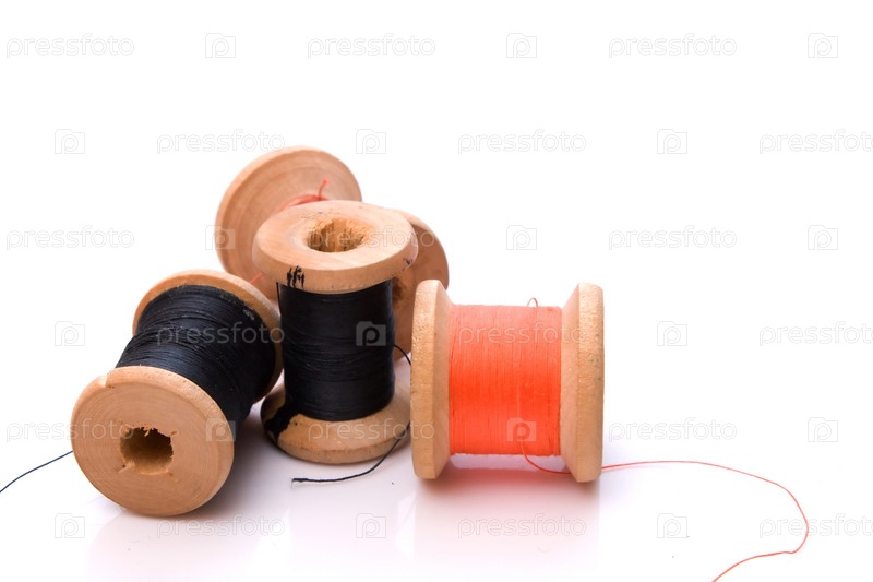 Катушки ниток на белом фоне