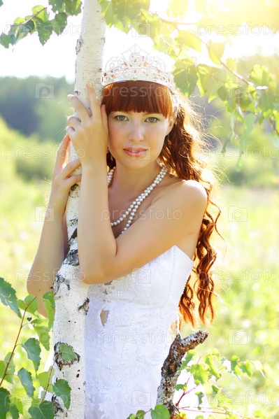 Красивая девушка рядом с березой