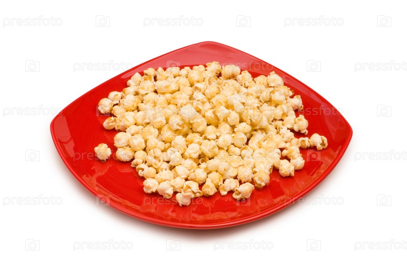 Попкорн на красной тарелке на белом фоне