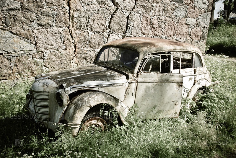 Старый брошенный автомобиль в траве рядом с домом